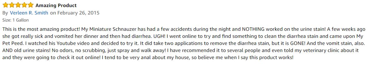 This is the most amazing product! My Miniature Schnauzer has had a few accidents during the night and NOTHING worked on the urine stain! A few weeks ago she got really sick and vomited her dinner and then had diarrhea. UGH! I went online to try and find something to clean the diarrhea stain and came upon My Pet Peed. I watched his Youtube video and decided to try it. It did take two applications to remove the diarrhea stain, but it is GONE! And the vomit stain, also. AND old urine stains! No odors, no scrubbing, just spray and walk away! I have recommended it to several people and even told my veterinary clinic about it and they were going to check it out online! I tend to be very anal about my house, so believe me when I say this product works!