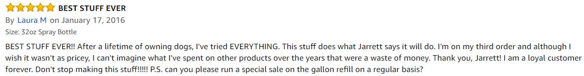 BEST STUFF EVER!! After a lifetime of owning dogs, I've tried EVERYTHING. This stuff does what Jarrett says it will do. I'm on my third order and although I wish it wasn't as pricey, I can't imagine what I've spent on other products over the years that were a waste of money. Thank you, Jarrett! I am a loyal customer forever. Don't stop making this stuff!!!!! P.S. can you please run a special sale on the gallon refill on a regular basis?