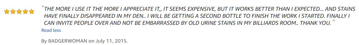 THE MORE I USE IT THE MORE I APPRECIATE IT,, IT SEEMS EXPENSIVE, BUT IT WORKS BETTER THAN I EXPECTED... AND STAINS HAVE FINALLY DISAPPEARED IN MY DEN.. I WILL BE GETTING A SECOND BOTTLE TO FINISH THE WORK I STARTED. FINALLY I CAN INVITE PEOPLE OVER AND NOT BE EMBARRASSED BY OLD URINE STAINS IN MY BILLIARDS ROOM.. THANK YOU.
