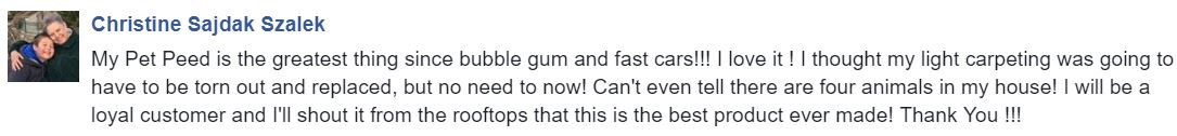 My Pet Peed is the greatest thing since bubble gum and fast cars!!! I love it ! I thought my light carpeting was going to have to be torn out and replaced, but no need to now! Can't even tell there are four animals in my house! I will be a loyal customer and I'll shout it from the rooftops that this is the best product ever made! Thank You !!!