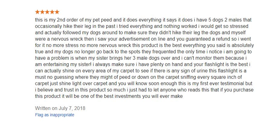 this is my 2nd order of my pet peed and it does everything it says it does i have 5 dogs 2 males that occasionally hike their leg in the past i tried everything and nothing worked i would get so stressed and actually followed my dogs around to make sure they didn't hike their leg the dogs and myself were a nervous wreck then i saw your advertisement on line and you guaranteed a refund so i went for it no more stress no more nervous wreck this product is the best everything you said is absolutely true and my dogs no longer go back to the spots they frequented the only time i notice i am going to have a problem is when my sister brings her 3 male dogs over and i can't monitor them because i am entertaining my sister! i always make sure i have plenty on hand and your flashlight is the best i can actually shine on every area of my carpet to see if there is any sign of urine this flashlight is a must no guessing where they might of peed or down on the carpet sniffing every square inch of carpet just shine light over carpet and you will know soon enough this is my first ever testimonial but i believe and trust in this product so much i just had to let anyone who reads this that if you purchase this product it will be one of the best investments you will ever make