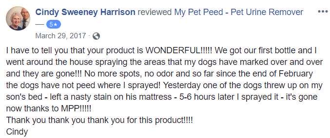 I have to tell you that your product is WONDERFUL!!!!! We got our first bottle and I went around the house spraying the areas that my dogs have marked over and over and they are gone!!! No more spots, no odor and so far since the end of February the dogs have not peed where I sprayed! Yesterday one of the dogs threw up on my son's bed - left a nasty stain on his mattress - 5-6 hours later I sprayed it - it's gone now thanks to MPP!!!!!