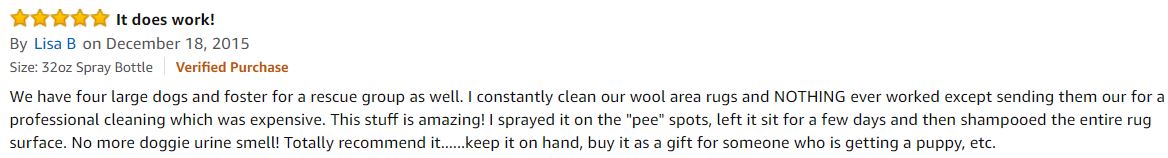 We have four large dogs and foster for a rescue group as well. I constantly clean our wool area rugs and NOTHING ever worked except sending them our for a professional cleaning which was expensive. This stuff is amazing! I sprayed it on the "pee" spots, left it sit for a few days and then shampooed the entire rug surface. No more doggie urine smell! Totally recommend it......keep it on hand, buy it as a gift for someone who is getting a puppy, etc.