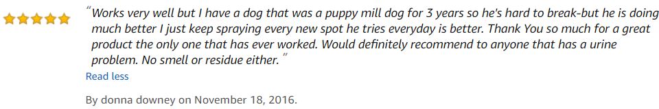 Works very well but I have a dog that was a puppy mill dog for 3 years so he's hard to break-but he is doing much better I just keep spraying every new spot he tries everyday is better. Thank You so much for a great product the only one that has ever worked. Would definitely recommend to anyone that has a urine problem. No smell or residue either.