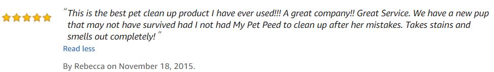 This is the best pet clean up product I have ever used!!! A great company!! Great Service. We have a new pup that may not have survived had I not had My Pet Peed to clean up after her mistakes. Takes stains and smells out completely!