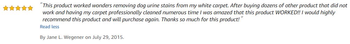 This product worked wonders removing dog urine stains from my white carpet. After buying dozens of other product that did not work and having my carpet professionally cleaned numerous time I was amazed that this product WORKED!! I would highly recommend this product and will purchase again. Thanks so much for this product!