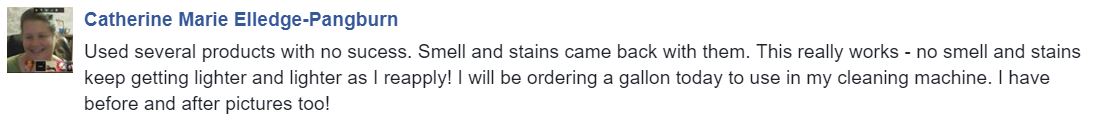 Used several products with no success. Smell and stains came back with them. This really works - no smell and stains keep getting lighter and lighter as I reapply! I will be ordering a gallon today to use in my cleaning machine. I have before and after pictures too!
