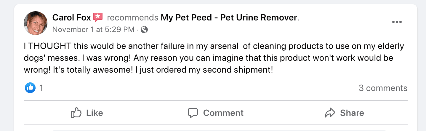 So we’re just going to continue doing what has worked so far; sharing the truth about why pet stains and odors are not your fault, why most of the cleaning options don’t work, and then personally inviting you to try a bottle of ‘My Pet Peed’ for yourself.